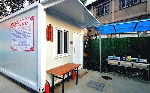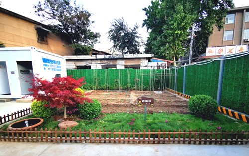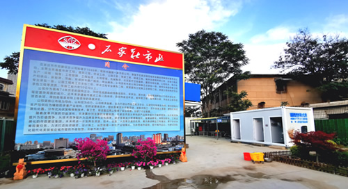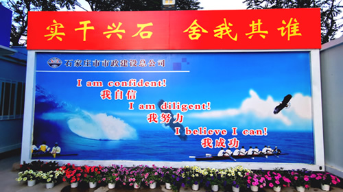 中央商務(wù)區(qū)正太廣場項目部,根據(jù)現(xiàn)場實際情況及廣場圖紙,因地制宜,利用原地道橋位置進(jìn)行簡約化設(shè)計,占地東西長40米,南北寬20米。麻雀雖小五臟俱全,項目布局充分利用移動板房外立面做文化設(shè)計,用作公司簡介宣傳墻、食堂文化宣傳墻及旗桿背景墻。項目部除辦公區(qū)外,還設(shè)置了餐廳、獨立衛(wèi)生間、淋浴間等生活設(shè)施以及微景觀種植園等休閑場所,整個項目部簡約而不簡單,注重以人為本,盡可能提高項目部人員工作、生活水平,激發(fā)了干部職工干事創(chuàng)業(yè)的激情,為推進(jìn)項目建設(shè)提供了有力支撐。